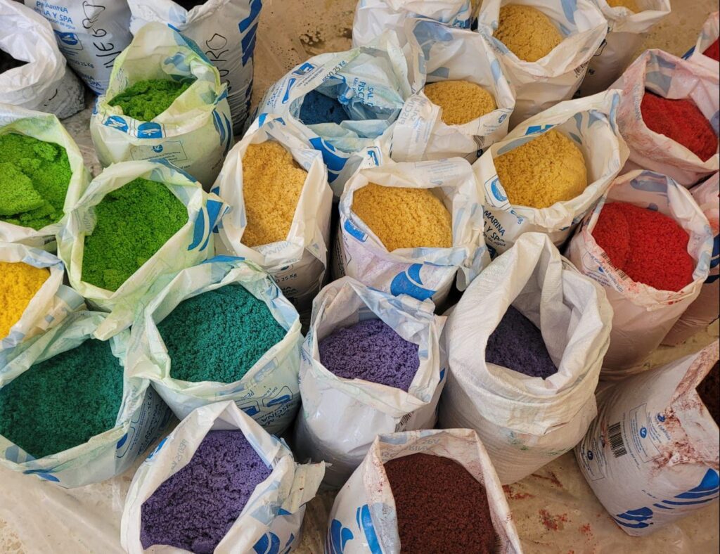 Un laborioso y minucioso trabajo para el que se ha creado una comisión formada por casi una veintena de cofrades, hermanos de varias cofradías agrupadas, que tras acordar el diseño, han confeccionado las plantillas e incluso ellos mismos han tintado la sal en un amplio abanico de tonalidades para dar vida a los diseños.